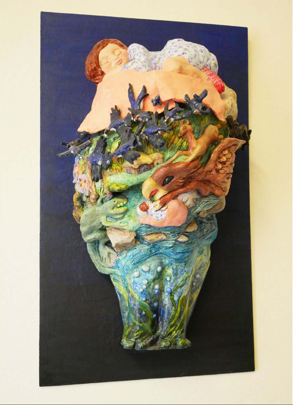 gesso, papier mache pulp, mesh, paint, foam, wood